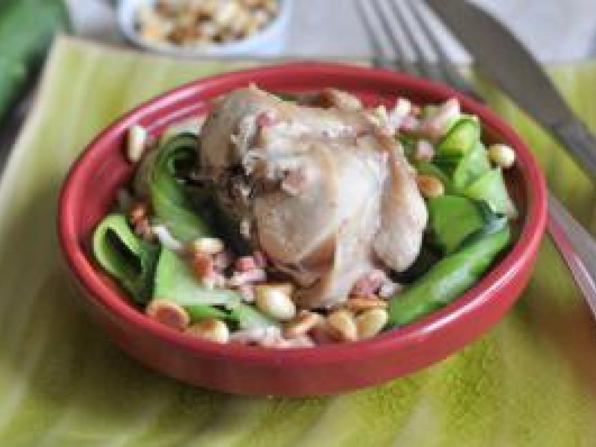 Lapin aux tagliatelles de courgette Platfacile1 h 20 m3129 Kcal Envoyer cette recette à un ami Imprimer cette page Poser une question à l'auteur Publier votre photo de cette recette Ingrédients 1 1 kg Lapin 125 g Lardons 6 Courgettes 1 Bouquet garni 2 Gousse ail 2 cuillère à soupe Pignons de pin 2 cuillères à soupe Parmesan 30 cl Vin blanc sec de table 3 cuillères à soupe d'Huile d’Olive 1 pincée Poivre 1 pincée Sel