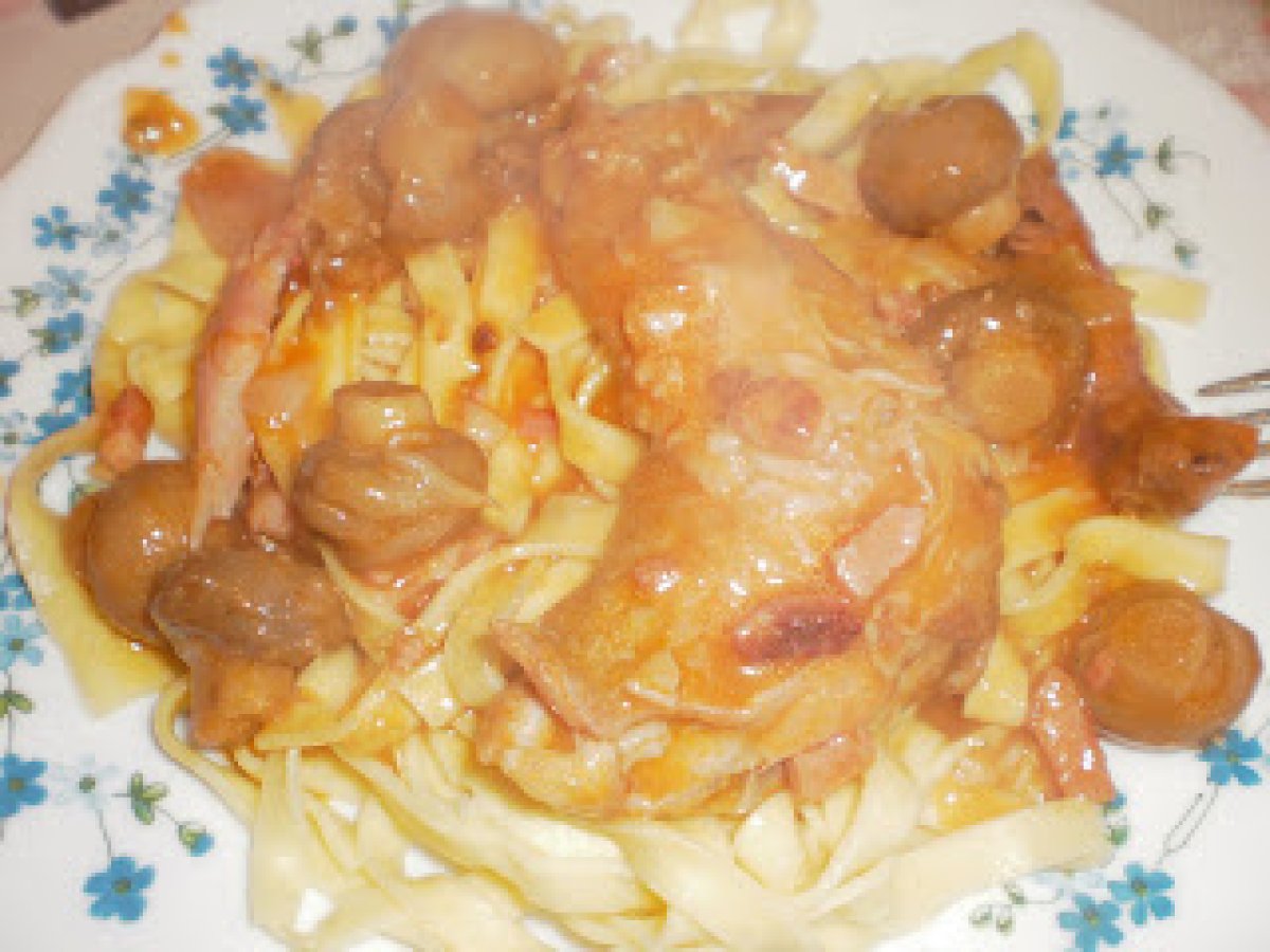 - Disposez le lapin, et ajoutez les lardons et oignons.
