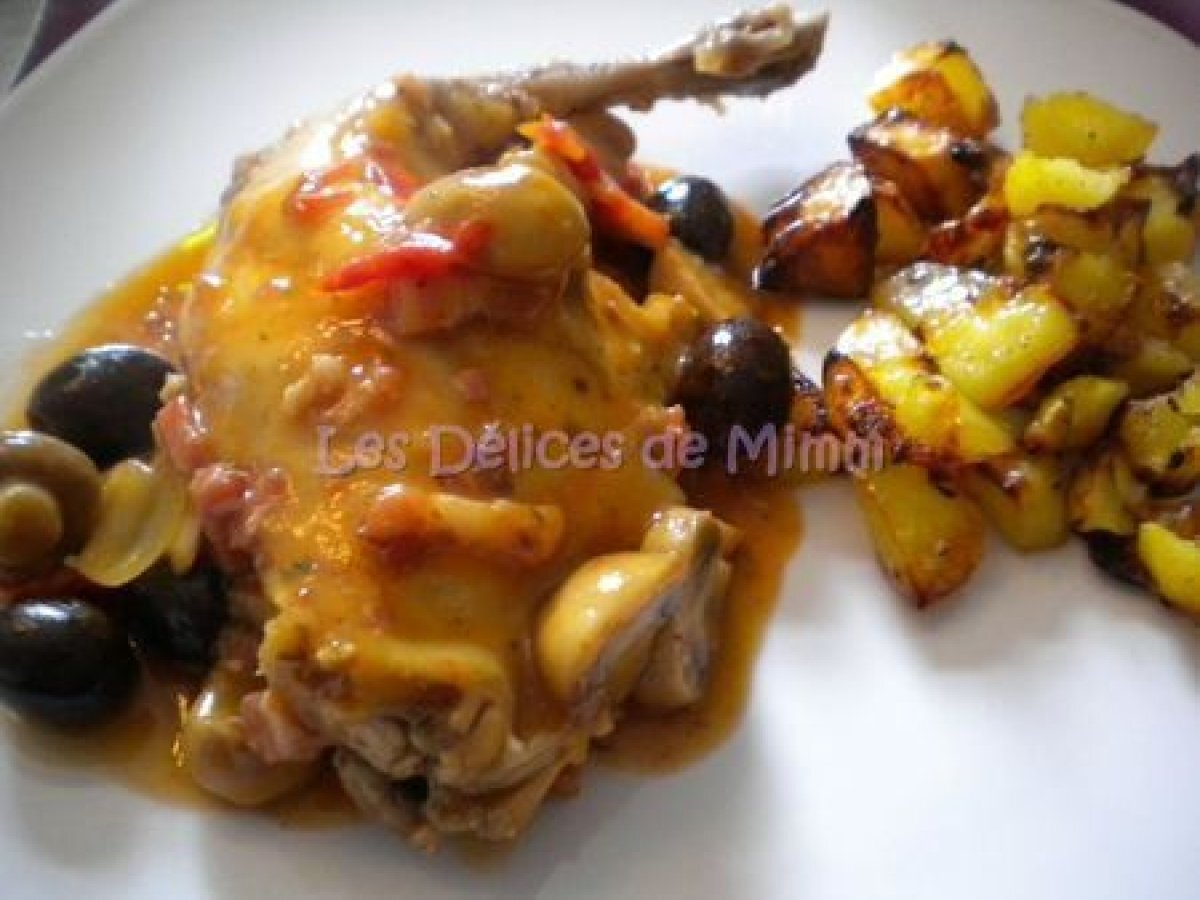 Lapin confit aux tomates semi-séchées, lardons, olives et champignons