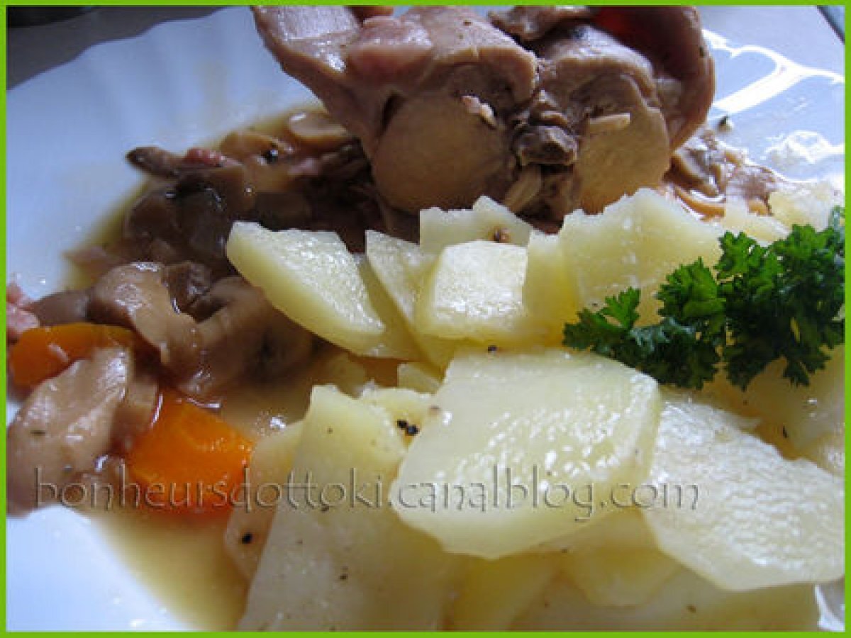 - Pendant ce temps, éplucher les pommes de terre, les couper en rondelles, les déposer dans le panier vapeur. Saler et poivrer.