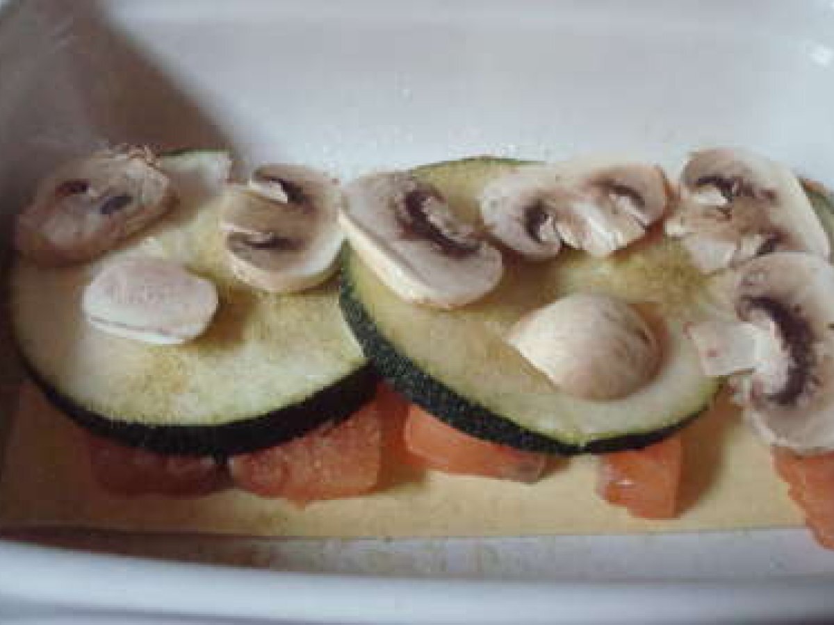 Lasagnes saumon / courgettes PrécédentSuivant Platmoyen40 min Envoyer cette recette à un ami Imprimer cette page Poser une question à l'auteur Publier votre photo de cette recette Ingrédients 2 Pour 2 personnes : > 6 feuilles de lasagnes > 2 pavés de saumon > 4 champignons de Paris > 12 grandes rondelles de courgette > 1/4 de bûche de chèvre > 6 cuillères à soupe d'eau > 1 cuillère à café de fond de veau > 1 cuillère à café de maïzena > 25 cl de crème > 1 cuillère à café de sauce tomate > 1 cuillère à café de coriandre en poudre