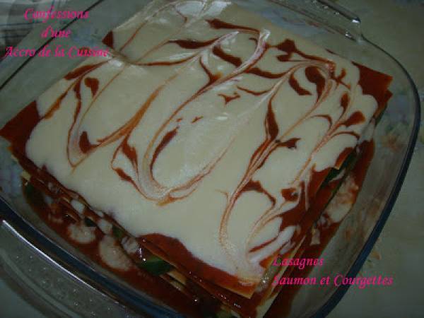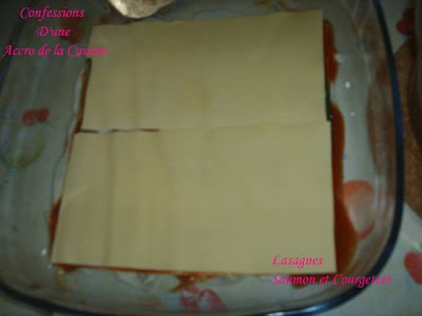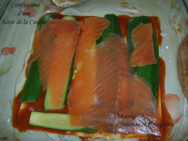 Lasagnes saumon et courgettes PrécédentSuivant Platfacile1 h 35 m Envoyer cette recette à un ami Imprimer cette page Poser une question à l'auteur Publier votre photo de cette recette Un plat complet, facile à faire et dont le résultat est délicieux! Ingrédients 6 Un paquet de lasagnes 4 grosses courgettes 8 tranches de saumon fumé 500 ml de coulis de tomates sel poivre piment en poudre ail en poudre origan Pour la sauce béchamel: 50 g de beurre 2 cuillères à soupe de farine 1/2 litre de lait 25 cl d'eau sel noix de muscade