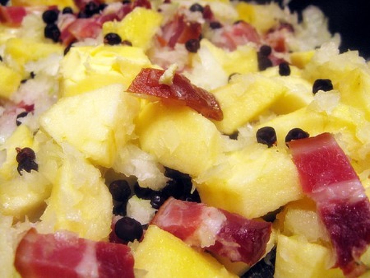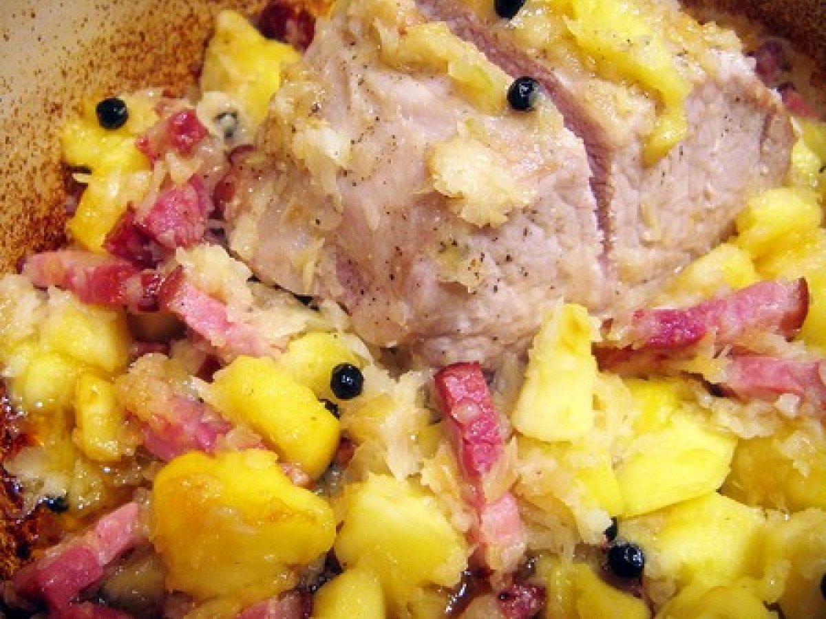 Le rôti de porc à l'ardennaise ou le rôti aux pommes, peket et lard.