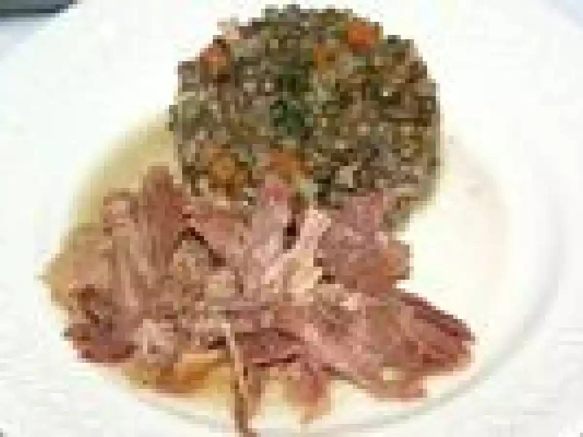 Lentilles vertes du puy, effiloché de confit votez maintenant Platfacile30 min592 Kcal Envoyer cette recette à un ami Imprimer cette page Poser une question à l'auteur Publier votre photo de cette recette Ingrédients 4 1/2 oignon 1/2 carotte 2 champignons de Paris taillés en brunoise 150 g de lardons fumés 1/2 gousse d'ail 200 g de lentilles 4 cuisses confites de canard une vinaigrette persil plat haché 1 échalote ciselée