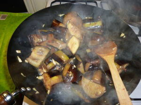 - Dans un wok, faire chauffer un peu d'huile, y faire revenir les aubergines à feu vif jusqu'à ce qu'elles soient dorées à l'extérieur et commencent cuire à l'intérieur.