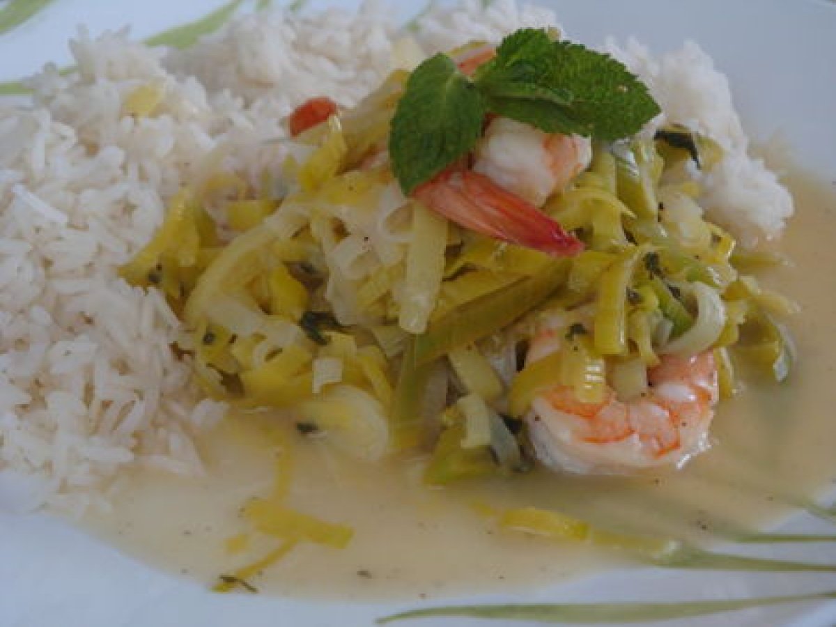 Les crevettes aux poireaux sauce au citron et à la menthe votez maintenant Platfacile25 min Envoyer cette recette à un ami Imprimer cette page Poser une question à l'auteur Publier votre photo de cette recette Ingrédients 2 180 gr de crevettes décortiquées et déveinées 1 poireau 1 cuillère à café d'huile d'olive Le jus et les zestes d'un citron 1/2 tasse de fumet ou de bouillon 1 Cuillère à soupe de miel 1 cuillère à café de maïzena une dizaine de feuilles de menthe sel poivre