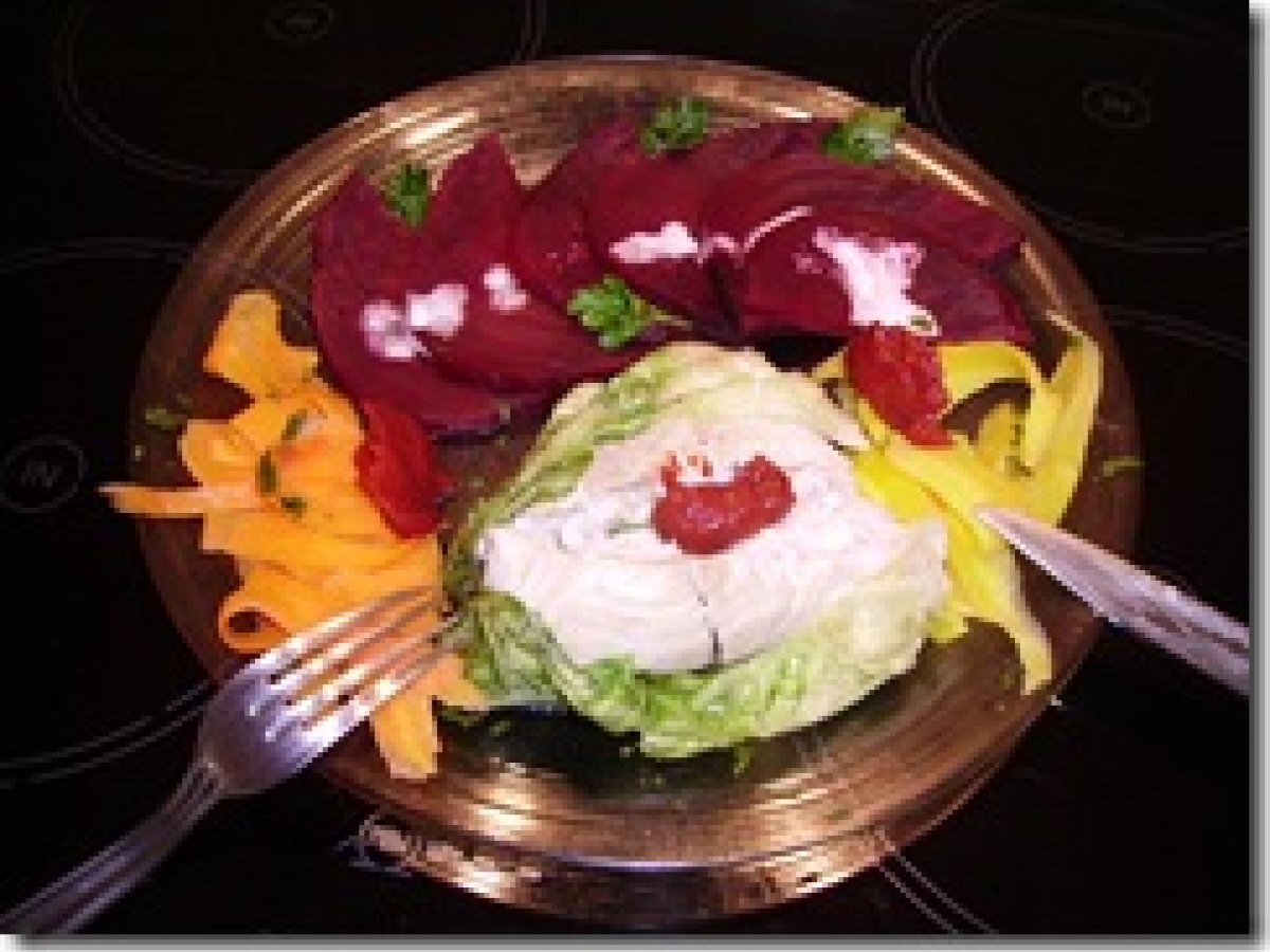 Lieu noir en papillote et ses légumes . PrécédentSuivant Platfacile1 heure155 Kcal Envoyer cette recette à un ami Imprimer cette page Poser une question à l'auteur Publier votre photo de cette recette Ingrédients 6 500 g de betteraves crues 500 g d'eau Sel 700 g de lieu noir (4 filets) 8 grandes feuilles de laitue Poivre Sel Carottes préparées en tagliatelles 1 jus de citron 4 cuillerées à café de sauce soja douce 4 cuillerées à café de sauce tomates Lait de coco pour la décoration