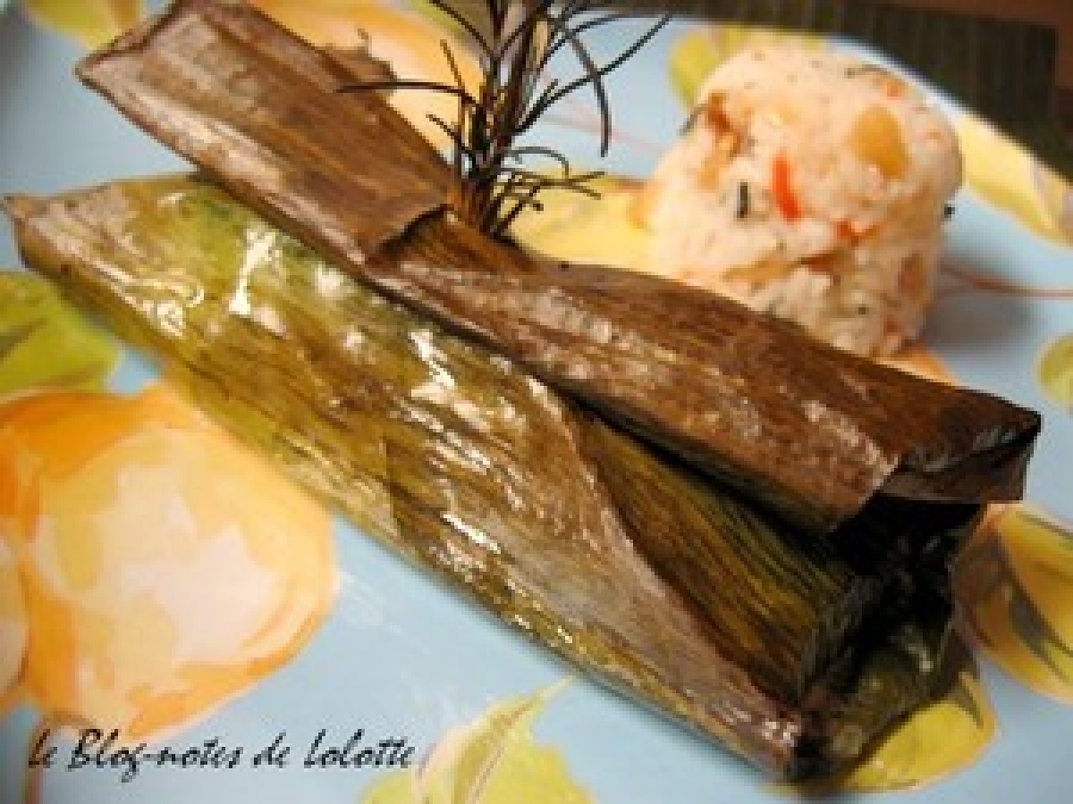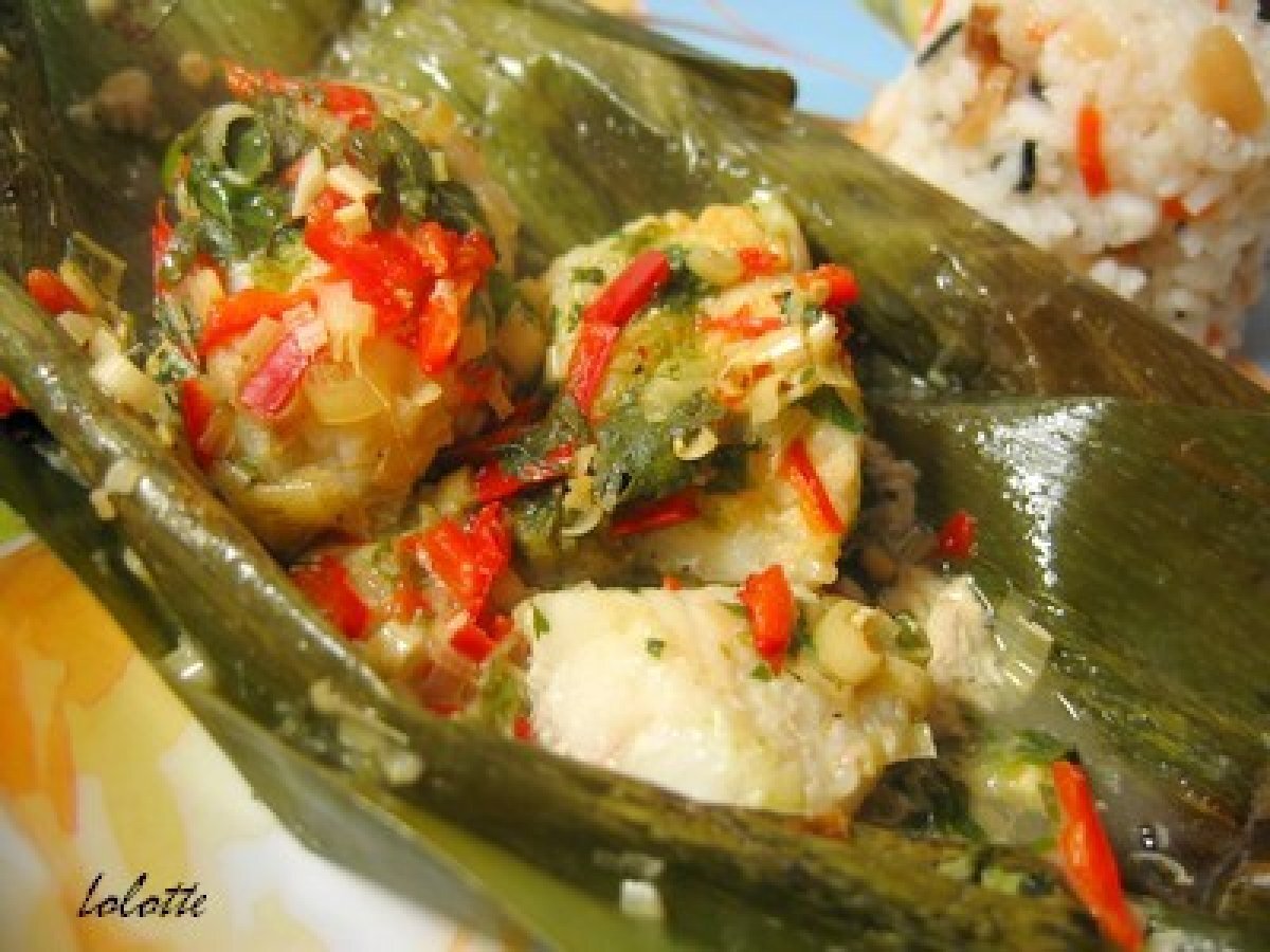 Lotte au gingembre, piment, coriandre et coco, en habit de bananier