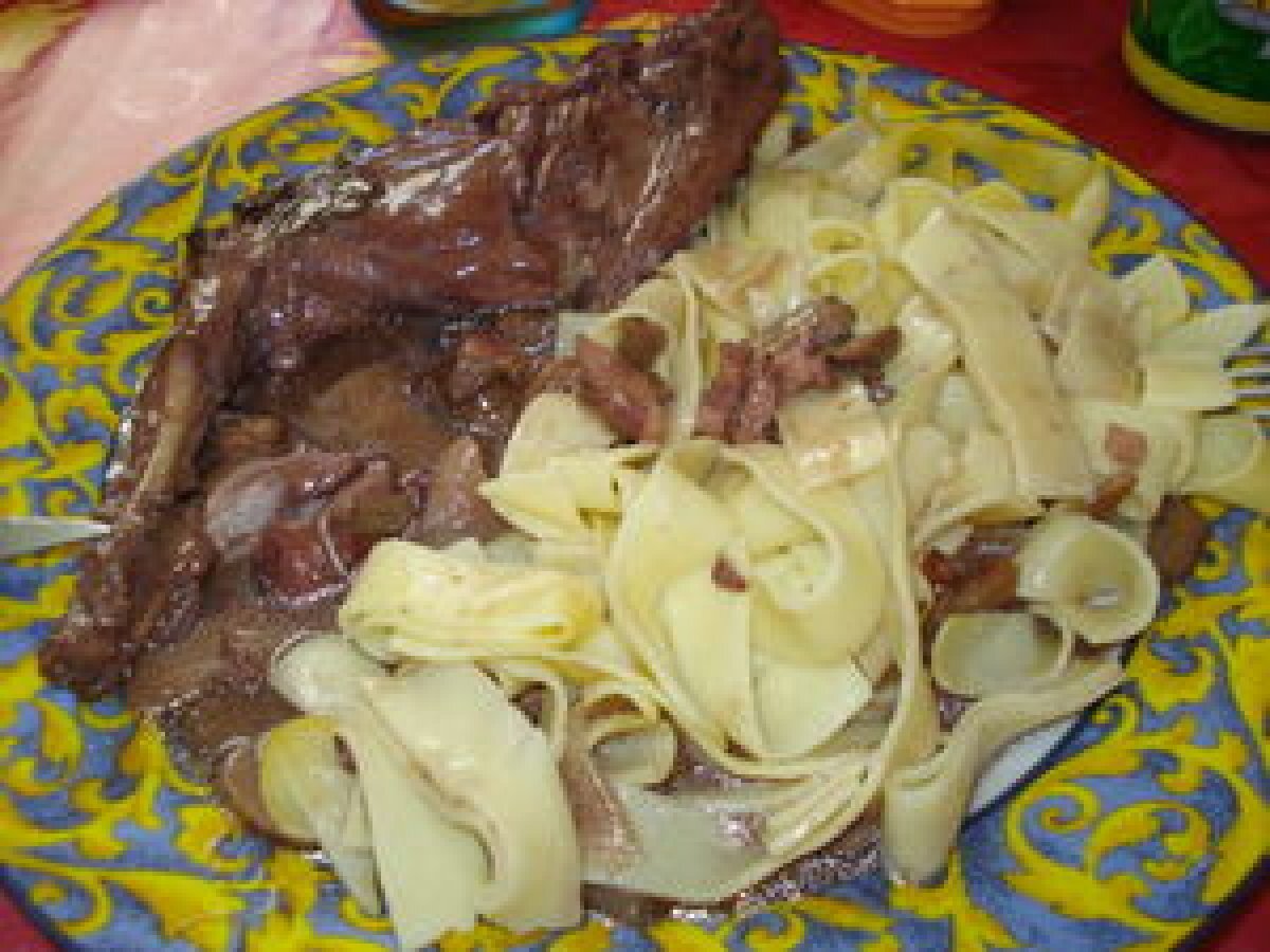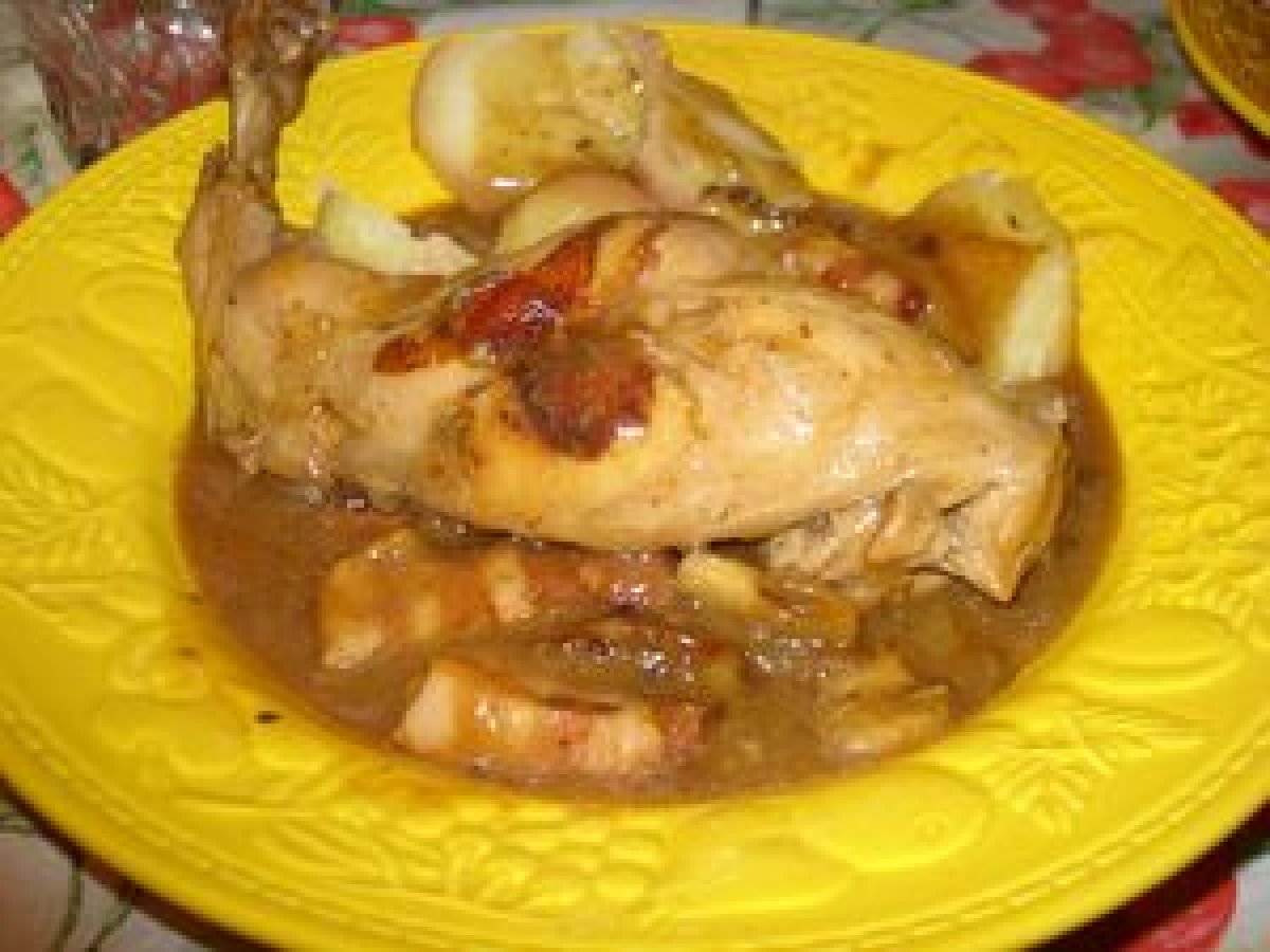 - Faire revenir le lapin découpé avec les oignons épluchés et coupés en quartiers, dans un peu d'huile.