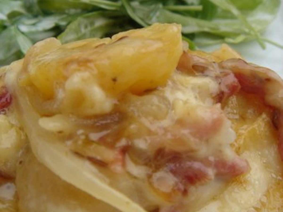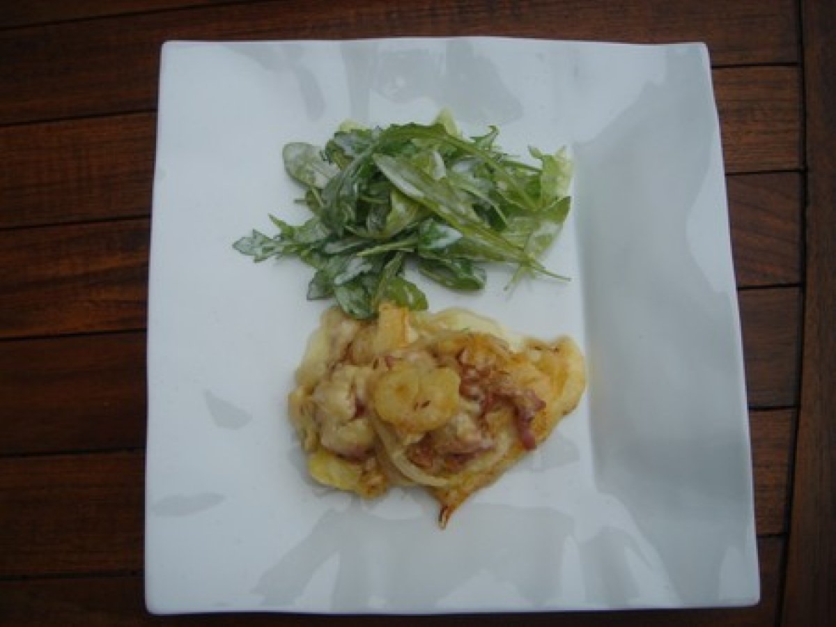 Pour cette tartiflette, vous pouvez l'accompagné avec une salade roquette avec une vinaigrette balsamique. C'est très bon !!