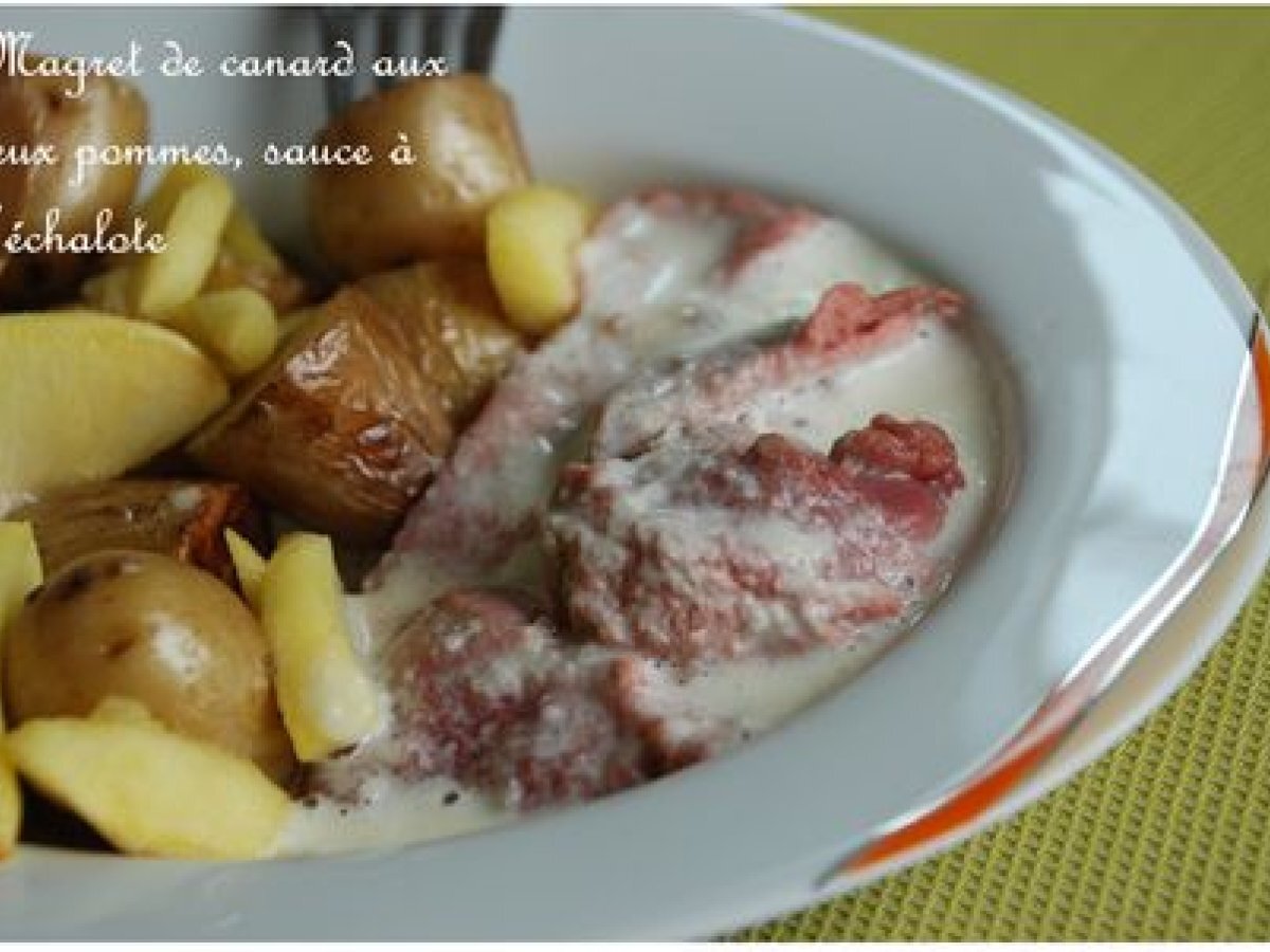 Magret de canard aux deux pommes, sauce à l'échalote votez maintenant PrécédentSuivant Platfacile17 min1143 Kcal Envoyer cette recette à un ami Imprimer cette page Poser une question à l'auteur Publier votre photo de cette recette Ingrédients 2 2 magrets de canard 500 g de pommes de terre rates 4 feuilles de laurier 2 pommes 20 g de beurre 1 belle échalote 15 cl de bouillon de volaille 10 cl de crème fraîche