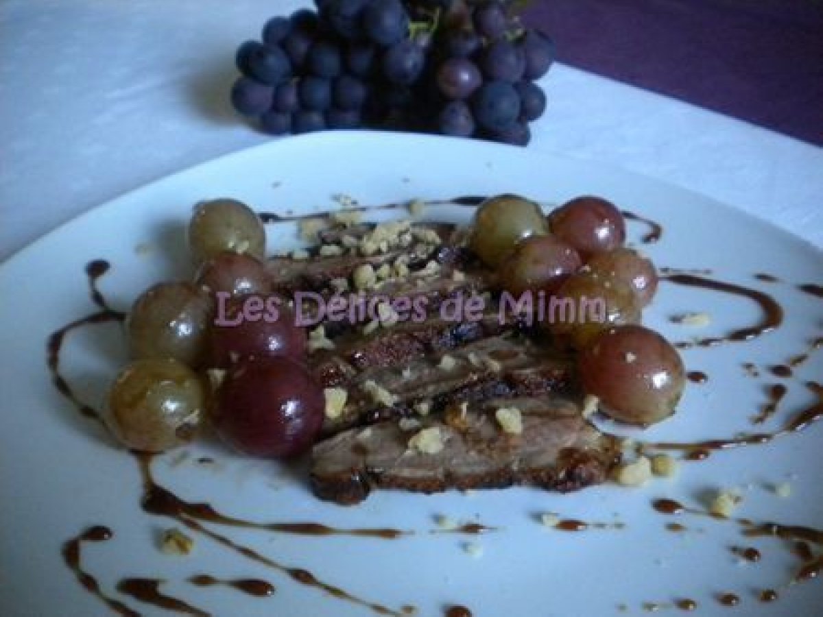 Magret de canard aux raisins Platfacile35 min567 Kcal Envoyer cette recette à un ami Imprimer cette page Poser une question à l'auteur Publier votre photo de cette recette Ingrédients 2 1 magret de canard 2 càs de vinaigre balsamique à la figue de d-gustation 2 c à s de sucre de canne sel poivre 1 petite grappe de raisins 200 ml de jus de pommes qs cerneaux de noix