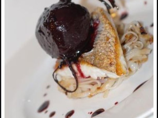 Maigre à l'unilatérale, betterave confite et nouilles asiatiques aux oignons