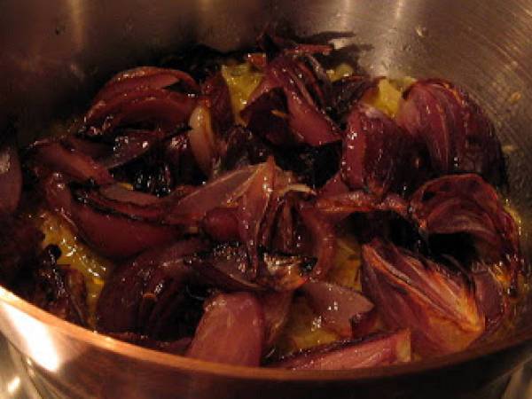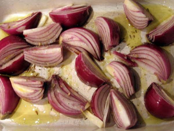 On coupe des oignons rouges en quart, on les met dans une forme allant au four, on les arrose bien avec de l'huile d'olive, on sale, on poivre et on ajoute quelques grains de fenouil et on met tout dans le four pendant 30, 40 minutes à 200°. Vérifiez de temps à l'autre!