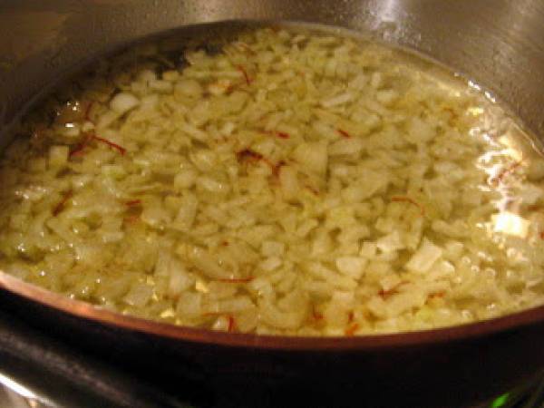 Pendant que les oignons sont au four, faites suer quelques échalotes, déglacez avec du vin blanc et ajoutez le safran. Laissez cuire pendant 10 minutes, la sauce devrait être réduite à moitié.