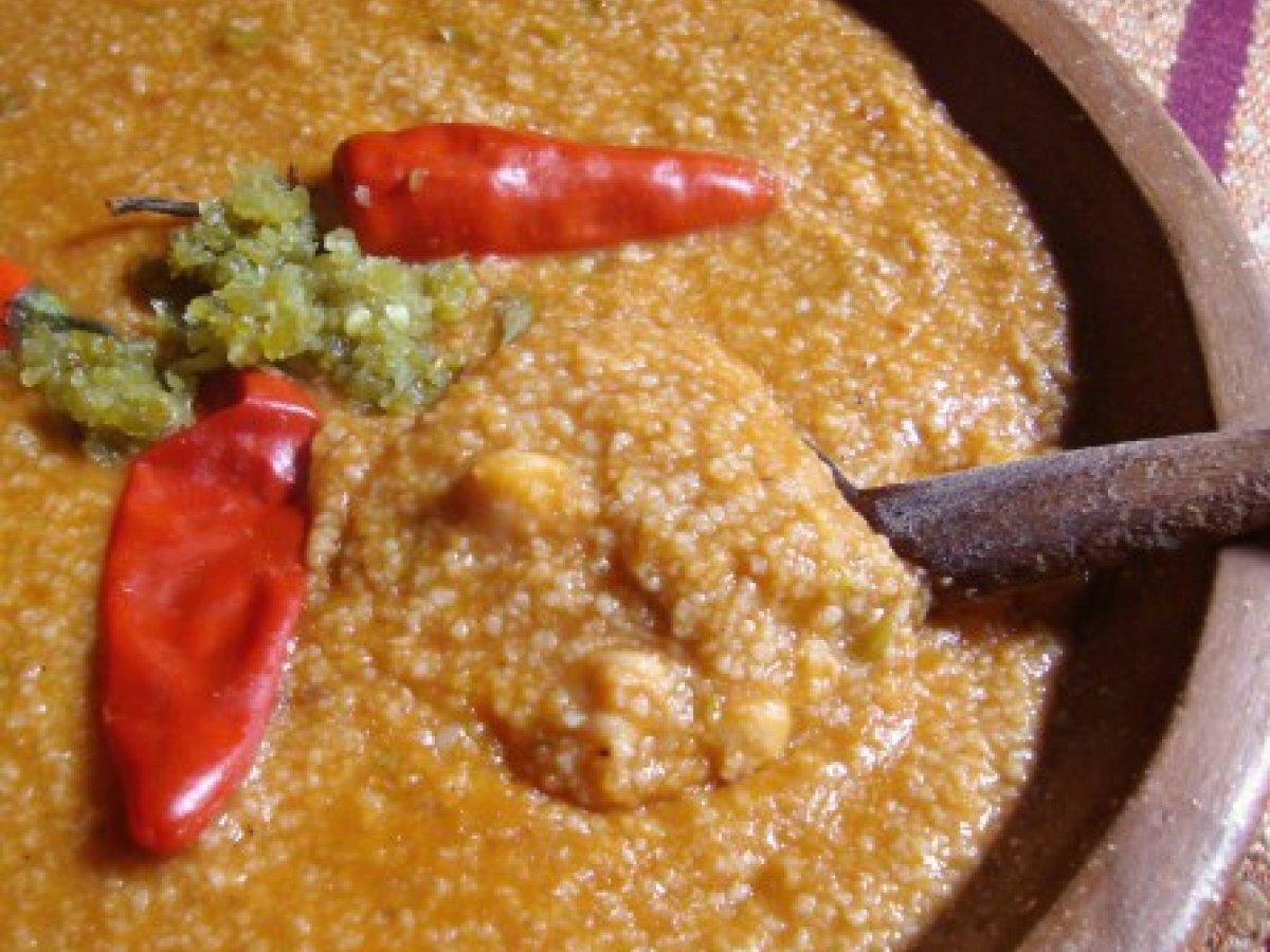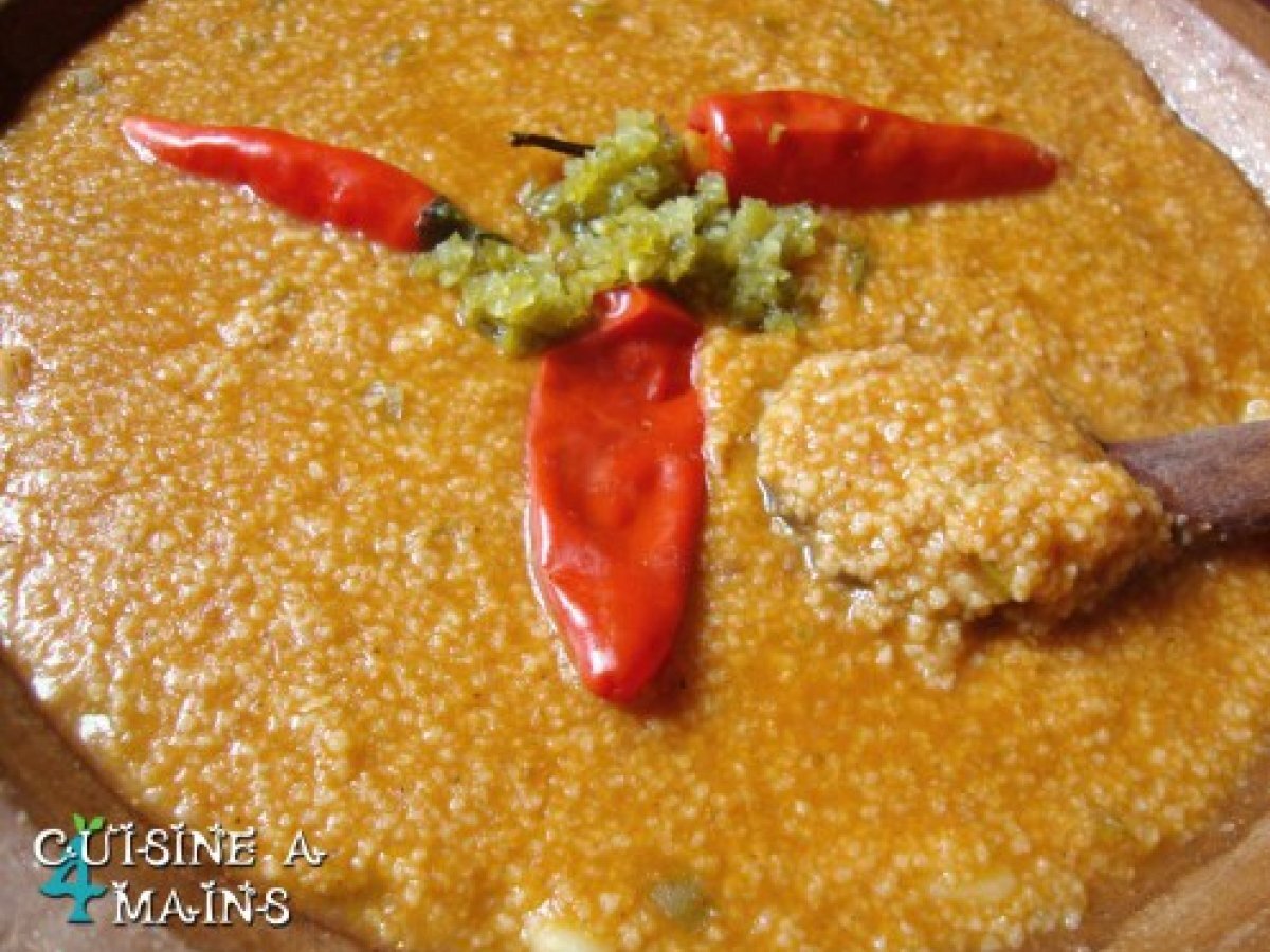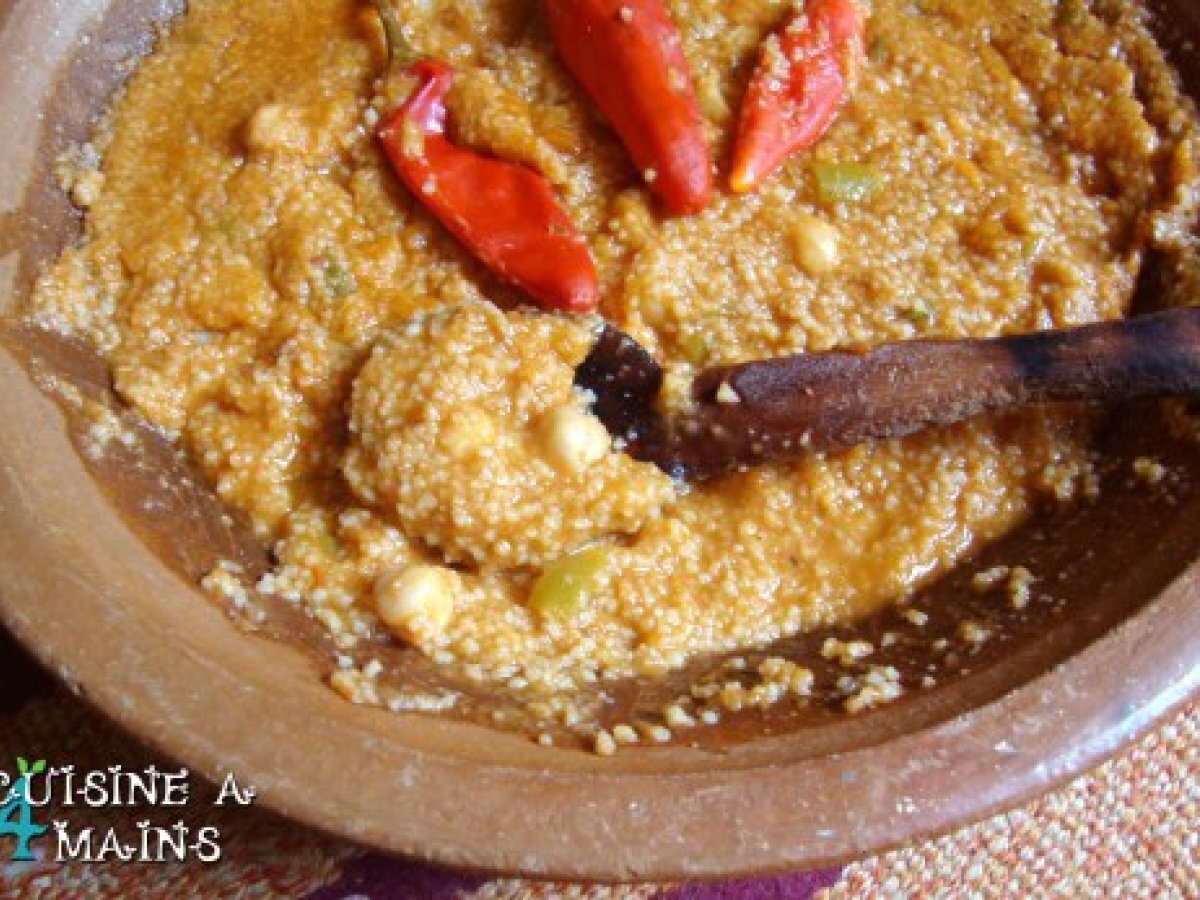 Meghmouma ou couscous à l'étouffée votez maintenant PrécédentSuivant Platfacile40 min Envoyer cette recette à un ami Imprimer cette page Poser une question à l'auteur Publier votre photo de cette recette Ingrédients 2 1 bol de gros couscous 2 gros oignons finement hachés 1 grosse tête d'ail finement hachée 2 grosses tomates mixées 1 pomme de terre coupée en petits morceaux 1 courgette coupée en petits morceaux 2 piments verts 2 piments rouges 1 poignée de pois chiches trempés la veille et cuits (facultatif) 1 cuillère à soupe de concentré de tomate 1 cuillère à soupe de ras el hanout 1 cuillère à soupe de paprika 1 cuillère à café de piments moulus 1 cube bouillon mouton ou poulet Sel en tenant compte du cube, poivre Huile 1,5 litre d'eau Boufedjoukh ou piment concassé : piments ail sel