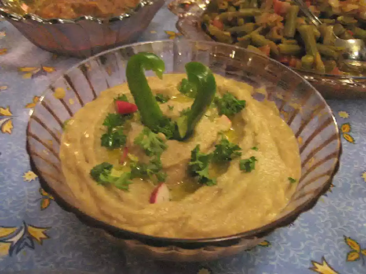 Houmous (trempette de pois chiches) et baba ganoush (caviar d'aubergines) et Loubya bi zet (haricots à l'huile et aux tomates)
