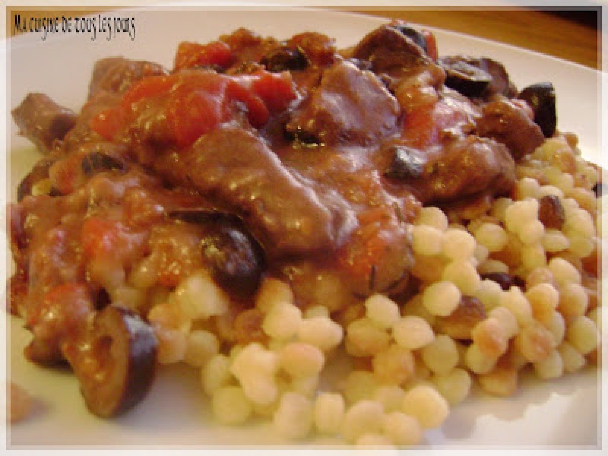 Mijoté de boeuf aux tomates et aux olives sur fregola