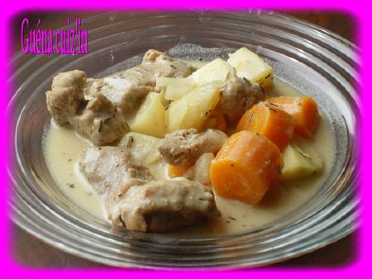 Mijoté de porc sauce blanche Platfacile30 min Envoyer cette recette à un ami Imprimer cette page Poser une question à l'auteur Publier votre photo de cette recette Ingrédients 6 800 g d"échine de porc 6 patates 6 carottes 1 échalote 2 cuillères à soupe de fond de veau 1 cuillère à soupe d'herbes de provence 2 cuillères à soupe d'huile d'olive 20 cl de vin blanc 3 cuillères à soupe de moutarde 20 cl de crème liquide
