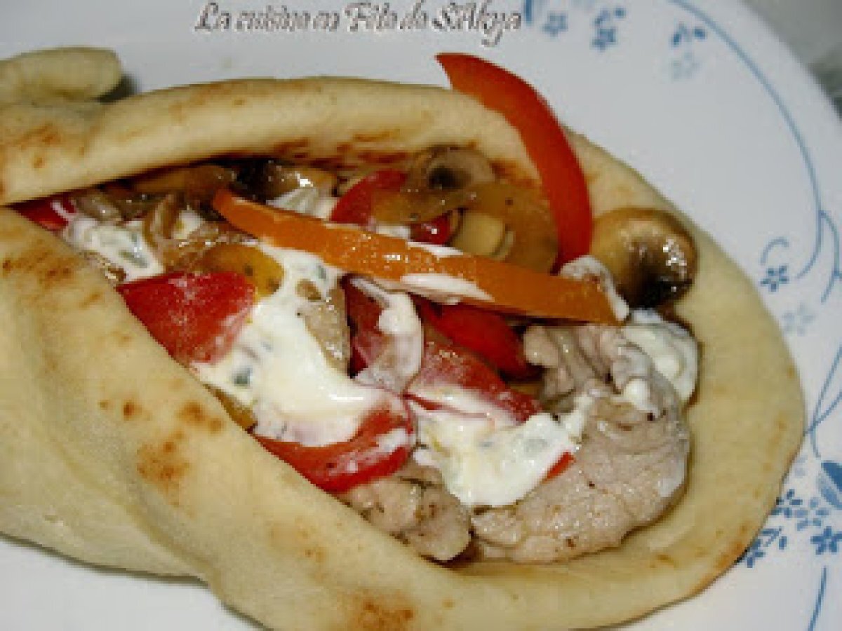 Naan farcie au porc avec légumes votez maintenant Platfacile22 min Envoyer cette recette à un ami Imprimer cette page Poser une question à l'auteur Publier votre photo de cette recette Ingrédients 4 1 cuillère à table d'huile d'olive 1 livre 450 g de porc coupé en lanière 1 cuillère à table de fécule de maïs ½ cuillère à thé d'origan 1 cuillère à table de jus de citron 1 cuillère à table de concentré de poulet Légumes : 1 cuillère à table d'huile d'olive 1 gros oignon Vidalia ou rouge au goût ½ piment de chaque, rouge, orange et jaune tranchés en longeur mince 7 à 8 champignons de paris tranchés minces 1 cuillère à thé concentré de poulet Sel poivre Sauce : Sauce Tzatziki maison ou acheté Pain Naan fait maison ou acheté