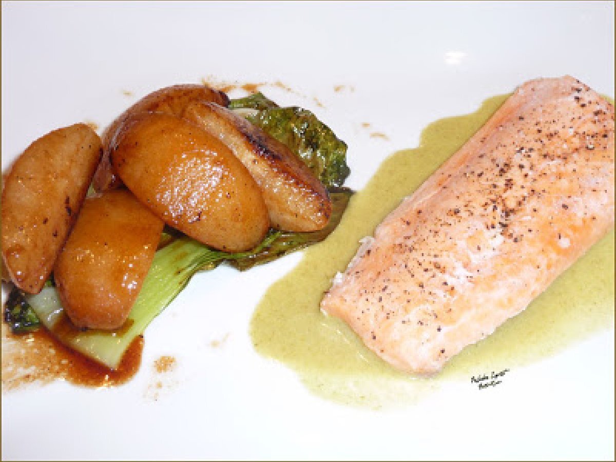Nashis rôtis au caramel de kola, sauce fenugrec ... votez maintenant PrécédentSuivant Platfacile1 h 25 m Envoyer cette recette à un ami Imprimer cette page Poser une question à l'auteur Publier votre photo de cette recette Ingrédients 2 Pour le Saumon: 1 joli pavé de Saumon Mix Sel, Sucre, Acide Citrique Sel et Poivre Pour la Sauce: 2 Choux Pak Choï Beurre Salé 20 cl de Fumet de Poisson 1 cuillère à soupe de Fenugrec en poudre 5 cl de Crème Liquide 7.5 cl de Jus d'Orange Pour les Nashis: 2 Nashis Poires 4 Noix de Kola 40 cl d'eau 30 g de Sucre 30 g de Beurre