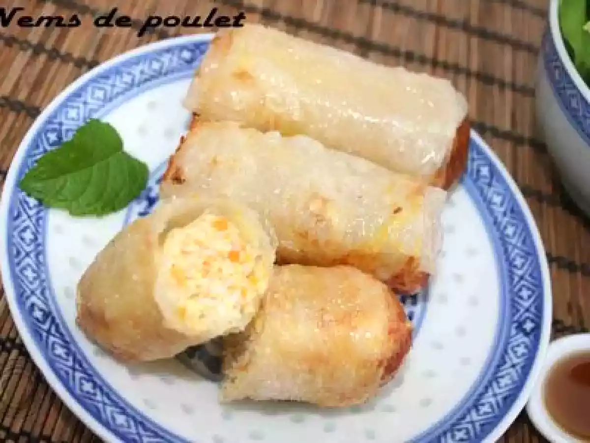 Nems au poulet votez maintenant PrécédentSuivant Platfacile15 min341 Kcal Envoyer cette recette à un ami Imprimer cette page Poser une question à l'auteur Publier votre photo de cette recette Ingrédients 3 6 galettes de riz un blanc de poulet 100 g de nouilles de riz un oeuf une carotte des champignons chinois Coût estimé: 2.33Euros€ (0.78€/part)