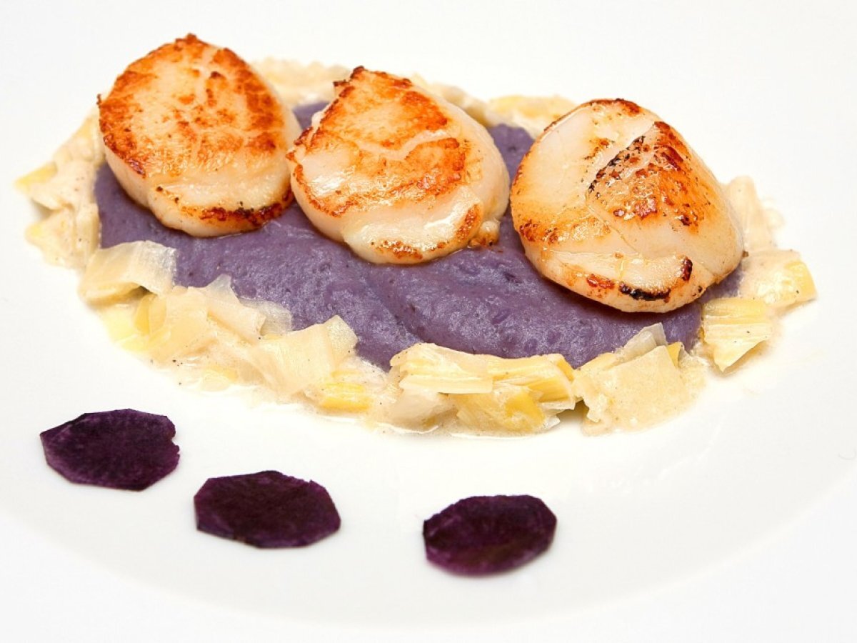Noix de saint-jacques, purée de vitelotte et fondue de poireaux Platfacile54 min617 Kcal Envoyer cette recette à un ami Imprimer cette page Poser une question à l'auteur Publier votre photo de cette recette Ingrédients 4 12 belles noix de Saint-Jacques 2 cuillères à soupe d’huile d’olive 1 kg de pommes de terre Vitelotte 3 gousses d’ail épluchées 25 cl de lait tiède 50 g de beurre sel poivre 2 blancs de poireaux 10 cl de crème fraîche 10 cl de vin blanc sec Coût estimé: 13.92Euros€ (3.48€/part)