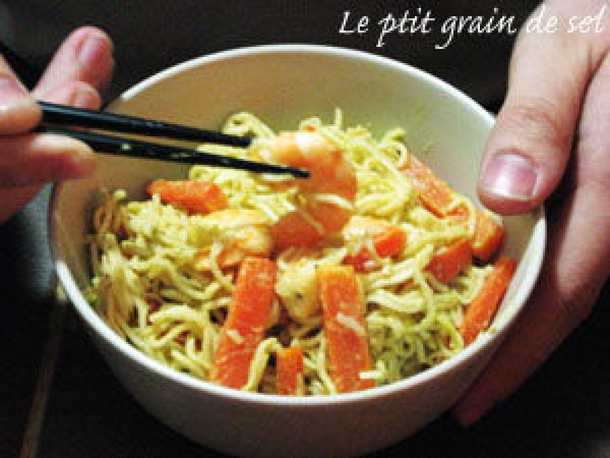 Nouilles asiat' au curry, crevettes, carottes et lait de coco Platfacile25 min496 Kcal Envoyer cette recette à un ami Imprimer cette page Poser une question à l'auteur Publier votre photo de cette recette Ingrédients 2 des nouilles chinoises 500 g de crevettes fraîches 3-4 carottes un petit pot de lait de coco Coût estimé: 9.9Euros€ (4.95€/part)