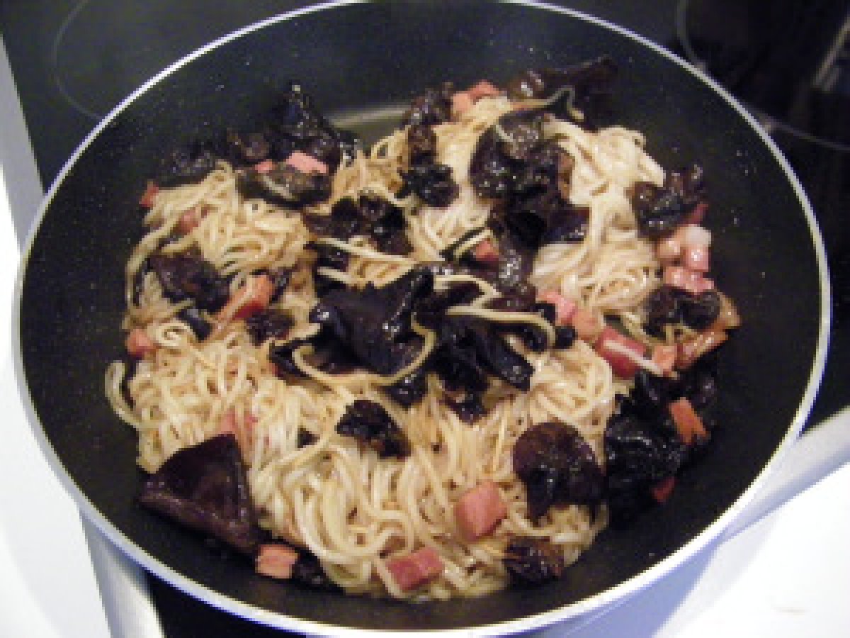 Nouilles asiatiques au jambon et aux champigons noirs Platfacile30 min207 Kcal Envoyer cette recette à un ami Imprimer cette page Poser une question à l'auteur Publier votre photo de cette recette Ingrédients 4 50 g de champignons noirs 200 g de jambon en dés 3 cuillères à soupe de sauce Yakitori 2 cuillères à soupe de sauce soja 400 g de nouilles asiatiques un peu d’huile de sésame Coût estimé: 6.8Euros€ (1.7€/part)