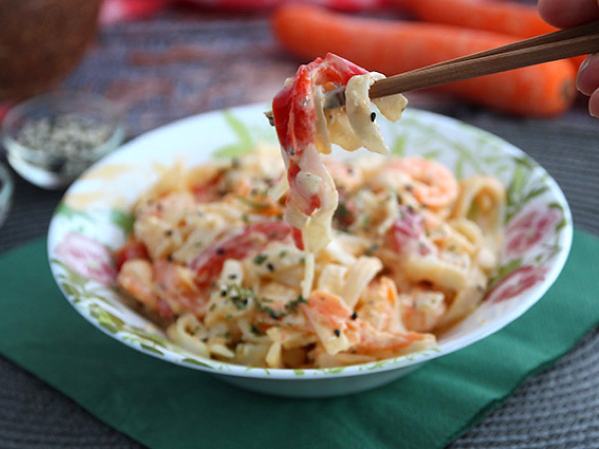 C'est l'heure du déjeuner et vous cherchez une recette facile / rapide ? Vous êtes au bon endroit avec ce plat de nouilles aux crevettes et légumes ! Une recette remplie de soleil et de saveurs grâce à l'ajout de lait de coco :-) Le petit plus ? Ce plat est naturellement "sans gluten" car les pâtes utilisées ici sont réalisées à base de farine de riz ;-) Il ne vous reste plus qu'à suivre pas à pas les étapes de notre recette et à déguster !