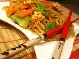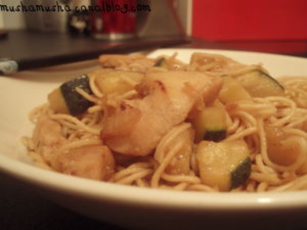 Nouilles sautées au poulet façon yakisoba Platfacile30 min570 Kcal Envoyer cette recette à un ami Imprimer cette page Poser une question à l'auteur Publier votre photo de cette recette Ingrédients 3 400 g d'escalopes de poulet découpés en fines lamelles 200 g de nouilles aux oeufs 8 cuillères à soupe de sauce soja japonaise 4 cuillères à soupe de miel 2 cuillères à soupe de Mirin 1 courgette moyenne 1 gros oignon Poivre Huile de sésame Cébette ou ciboulette Coût estimé: 8.15Euros€ (2.72€/part)