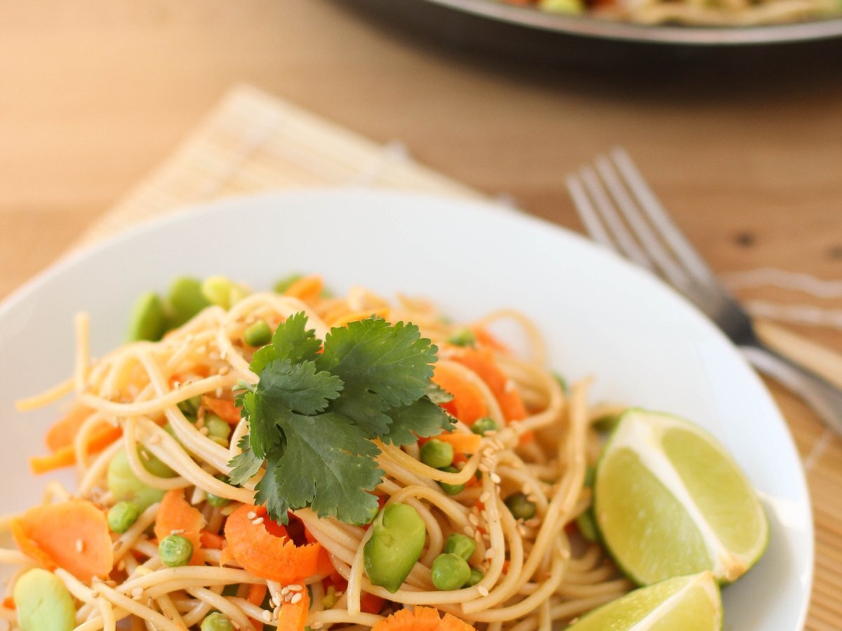 Nouilles sautées aux fèves, rubans de carottes et petits pois