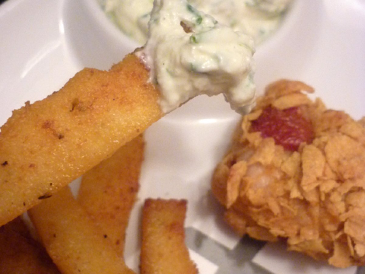 Nuggets de poulet et sa ptite sauce Platmoyen35 min Envoyer cette recette à un ami Imprimer cette page Poser une question à l'auteur Publier votre photo de cette recette Ingrédients 3 2 blancs de poulet, 15 tomates cerise séchées, 2 càs de parmesan râpé, 1 oeuf, sel et poivre , cornflakes. 100g de polenta, 50cl de lait, 1 càs d'origan, 1 gousse d'ail, 1 càs d'huile d'olive, sel et poivre. 2 petits suisses, 150g de fromage type philadelphia, sel et poivre, 3 càs d'huile d'olive, ciboulette, 2 càs de parmesan.