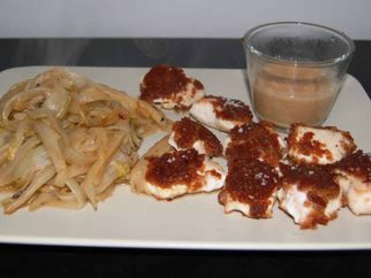 Nuggets de poulets bacon-spéculos, sauce sucrée et endives caramélisées votez maintenant PrécédentSuivant Platfacile25 min Envoyer cette recette à un ami Imprimer cette page Poser une question à l'auteur Publier votre photo de cette recette Ingrédients 4 4 filets de poulet 200g de spéculos 100g de bacon 2 blancs d'oeufs 20cl de crème allégée 4 cuillères à soupe de sauce soja sucrée