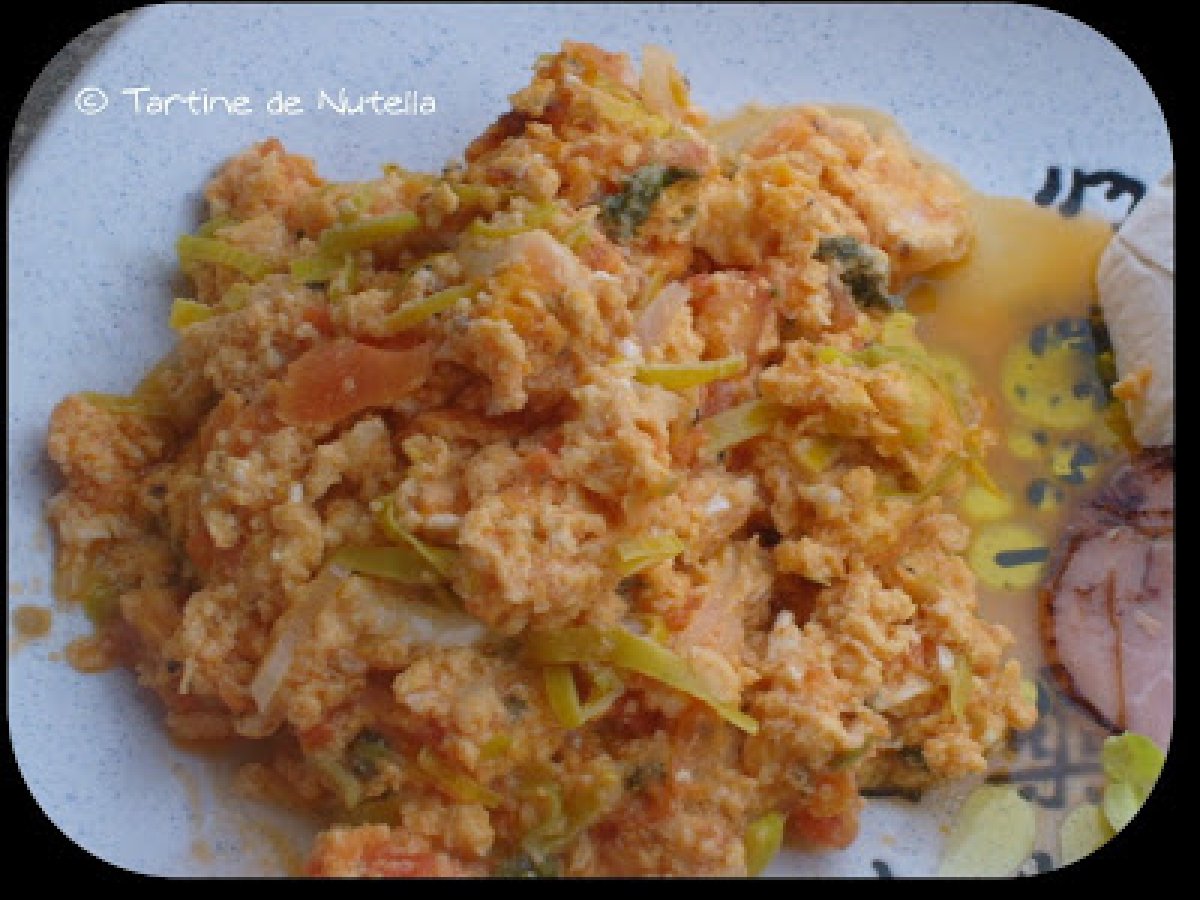 Oeufs brouillés à la portugaise mais avec quelques petits trucs en plus Platfacile9 min Envoyer cette recette à un ami Imprimer cette page Poser une question à l'auteur Publier votre photo de cette recette Ingrédients 1 2 tomates mondées 3 rondelles de poireau 1/2 échalote de l'huile d'olive au basilic 2 oeufs quelques cubes d'emmental du persil frisé