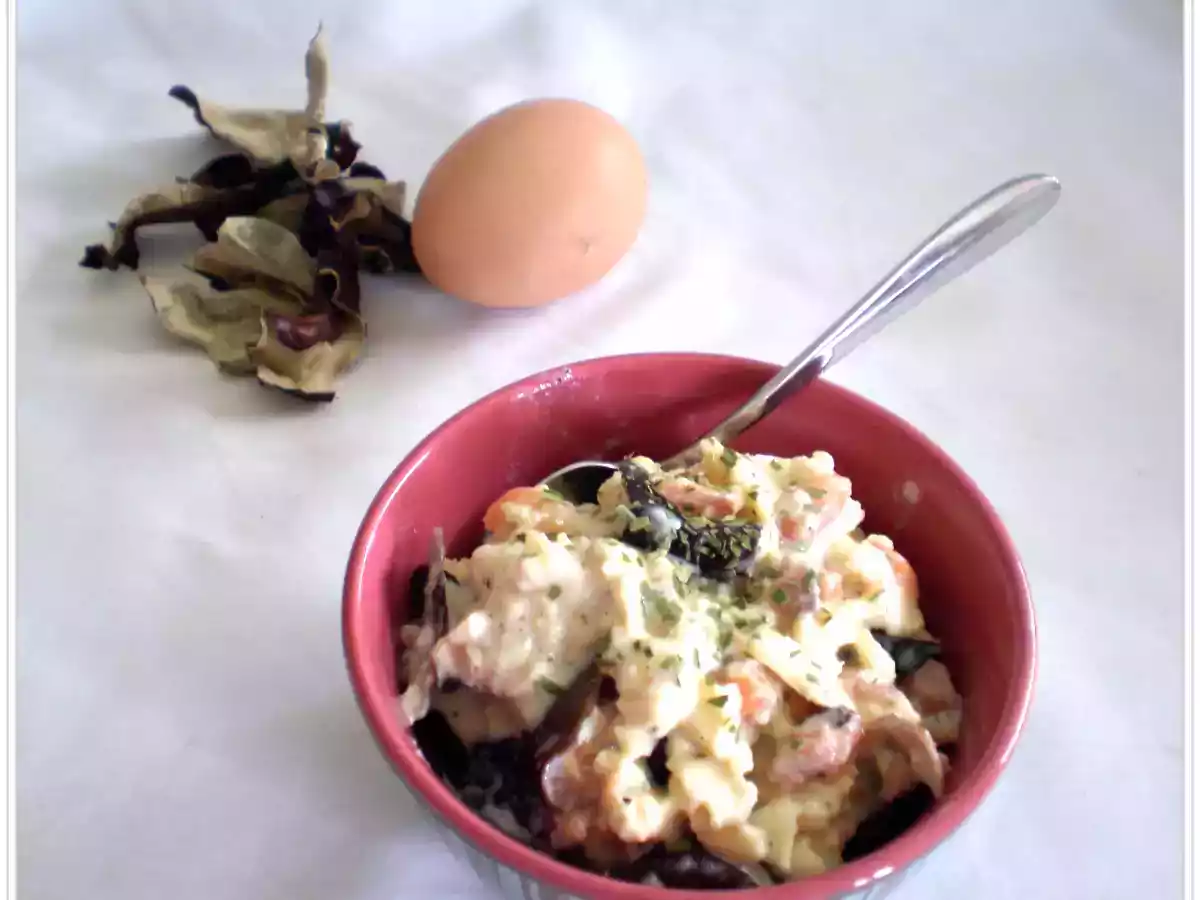 Oeufs brouillés au saumon fumé & champignons noirs Platfacile15 min Envoyer cette recette à un ami Imprimer cette page Poser une question à l'auteur Publier votre photo de cette recette Ingrédients 2 3 oeufs 100 g de chutes de saumon fumé 1 poignée de champignons noirs déshydratés 1 cs de crème de soja 1 cs d'estragon sel et poivre