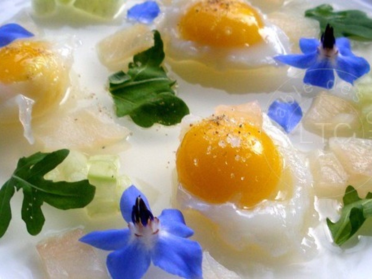 Oeufs de caille pochées sur une gelée de concombre votez maintenant PrécédentSuivant Platfacile20 min Envoyer cette recette à un ami Imprimer cette page Poser une question à l'auteur Publier votre photo de cette recette Ingrédients 4 16 ou 20 oeufs de caille 500 g d’eau 625 g de sucre 1 filet de féra fumée ou truite fumée 1 concombre 1,5 g de Lotas ou agar-agar sel poivre blanc vinaigre balsamique blanc feuilles d’oxalis fleurs de bourrache
