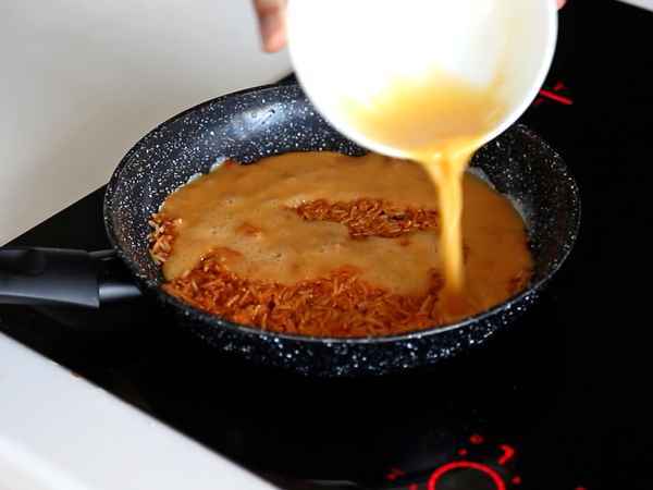 Battre les œufs puis les verser sur le riz, sur toute la surface de la poêle.