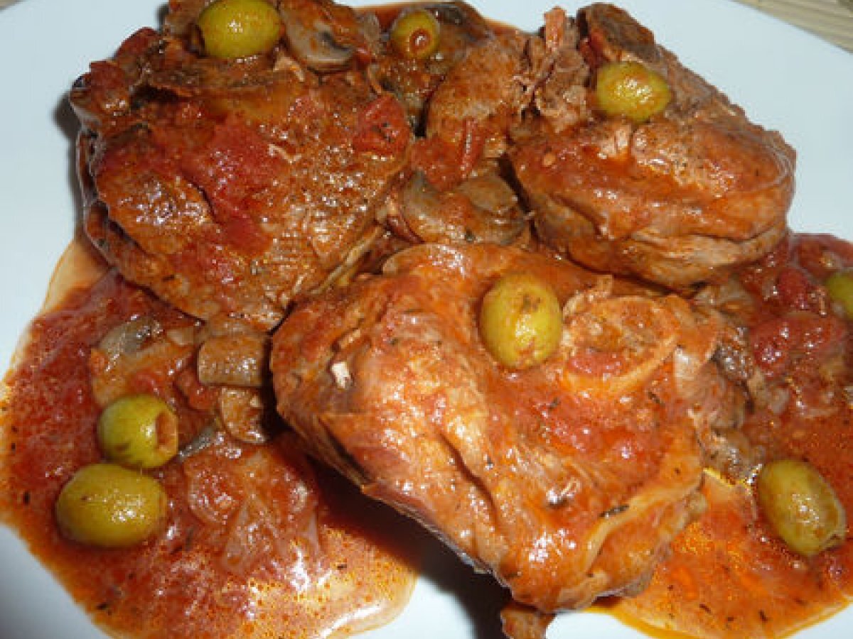 Osso-bucco de dinde à la tomate et aux vins cuits Platfacile1 h 45 m Envoyer cette recette à un ami Imprimer cette page Poser une question à l'auteur Publier votre photo de cette recette Ingrédients 6 6 osso-bucco de dinde 2 boîtes de pulpe de tomates en dés (400 g net chacune) 400 g de champignons de Paris 1 petit sachet d'olives vertes dénoyautées 1 verre de madère 1 verre de porto 1 oignon thym 40 g de beurre 1 cuillerée à soupe d'huile d'olive 1 pincée de piment fort sel poivre poivre 5 baies