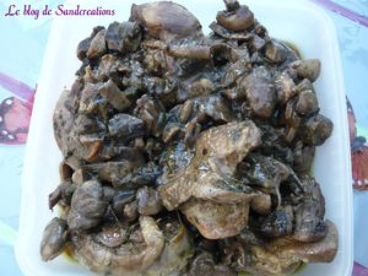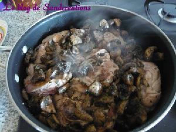 Déglacer avec un peu de vin blanc, sel poivre, ajouter les champignons frais coupés en morceaux, couvrir et faire cuire à feu doux pendant une petite heure.