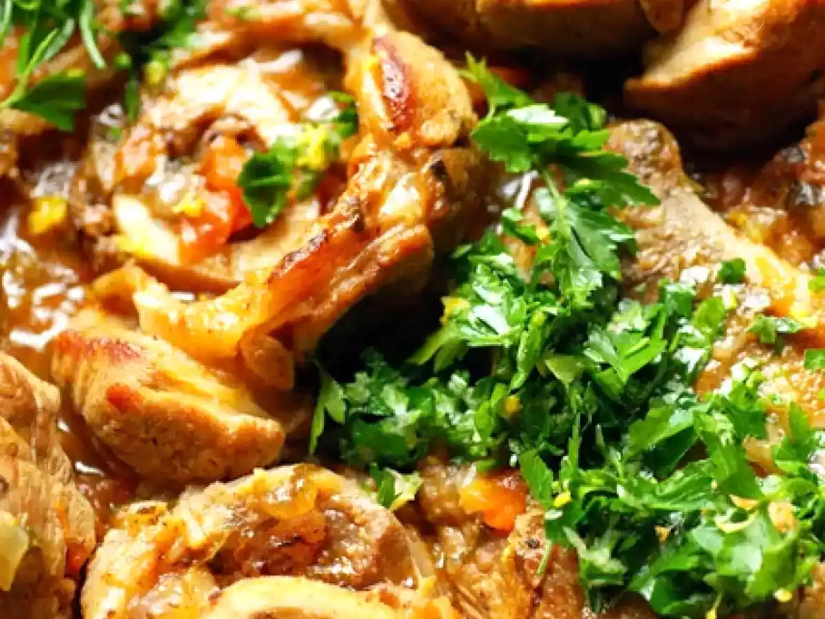 Osso buco au pamplemousse votez maintenant Platmoyen1 h 20 m436 Kcal Envoyer cette recette à un ami Imprimer cette page Poser une question à l'auteur Publier votre photo de cette recette Ingrédients 6 1 kg de jarret de veau coupé en tranches 20 g de beurre 1 cuillère à soupe d'huile d'olive 1 oignon coupé en petits cubes 1 branche de céleri émincée 1 carotte coupée en petits cubes 75 cl de bouillon de volaille 4 tomates pelées épépinées et concassées 2 cuillères à soupe de jus de pamplemousse ½ cuillère à café de sucre en poudre roux 1 gousse d'ail 1 petit bouquet de persil 1 cuillère à soupe de zeste râpé de pamplemousse 1 cuillère à soupe de pignons légèrement dorés sel et poivre
