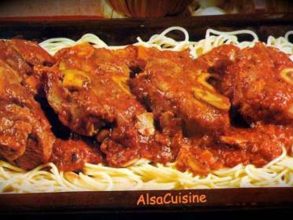 Osso-buco aux champignons Platmoyen1 h 20 m927 Kcal Envoyer cette recette à un ami Imprimer cette page Poser une question à l'auteur Publier votre photo de cette recette Ingrédients 4 4 tranches de jarret de veau 2 oignons 2 échalotes 2 carottes 4 tomates bien mûres 200 g de champignon de Paris 3 cuillères à soupe d'huile 30 g de beurre 2 cuillères à soupe de concentré de tomate 2 cuillères à soupe de farine 25 cl de vin blanc sec 10 cl de bouillon de boeuf (ou d'eau si pas de bouillon) 1 tête d'ail entière 1 bouquet garni Sel poivre du moulin Pour la garniture : 500 g de spaghetti