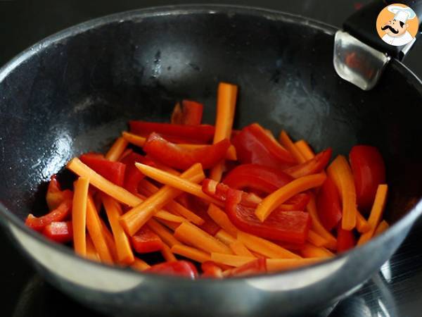 Réserver le tofu et garder l'huile. Ajouter les poivrons coupés en lamelles, les carottes coupées en bâtonnets et faire revenir pendant 2 à 3 minutes.