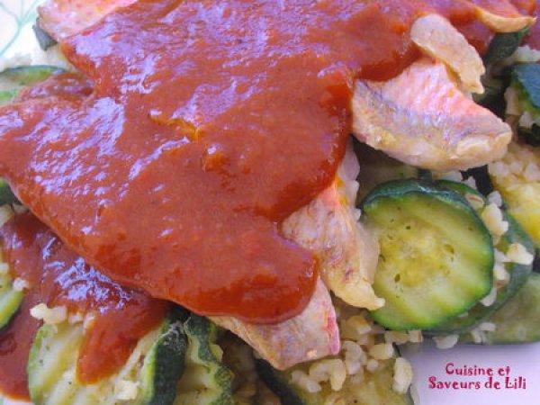 Papillote de filet de rouget sur lit de courgette et sauce aux poivrons votez maintenant Platfacile55 min Envoyer cette recette à un ami Imprimer cette page Poser une question à l'auteur Publier votre photo de cette recette Ingrédients 2 10 filets de rouget 1 belle courgette ou 2 petites 60 g de boulgour 1 cuillère à café de fumet de poisson feuilles de basilic sel poivre