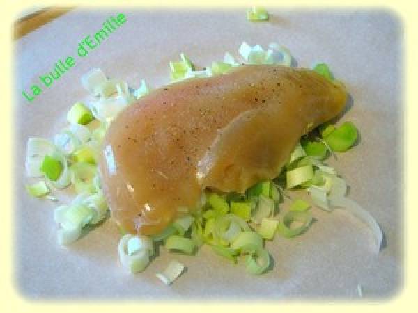 Papillote de poulet et poireau, sauce crémeuse aux champignons
