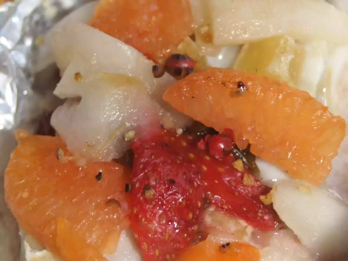Papillotes de poisson aux fruits .... pamplemousse, poires, fraises, raisins secs Platfacile30 min Envoyer cette recette à un ami Imprimer cette page Poser une question à l'auteur Publier votre photo de cette recette Ingrédients 1 1 filet de poisson blanc 1 fraise quelques lamelles de poires quelques quartiers de pamplemousse rose quelques raisins secs 1 cuillère à café de vinaigre de framboise sel et poivre quelques baies roses 1 belle pincée de mélange du trappeur