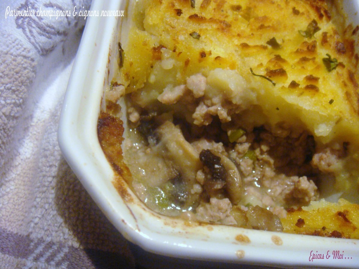 Parmentier de champignons et oignons nouveaux PrécédentSuivant Platmoyen1 heure553 Kcal Envoyer cette recette à un ami Imprimer cette page Poser une question à l'auteur Publier votre photo de cette recette Ingrédients 5 1 kg de veau haché 1 botte d'oignons nouveaux 500 g de champignons de Paris 5 grosses pommes de terre farineuses 30 cl de vin blanc 1/2 càc de cumin moulu 1/2 càc de mélange de curry Lait Beurre 2 càs d'huile d'olive 50 cl de bouillon de volaille Sel et poivre