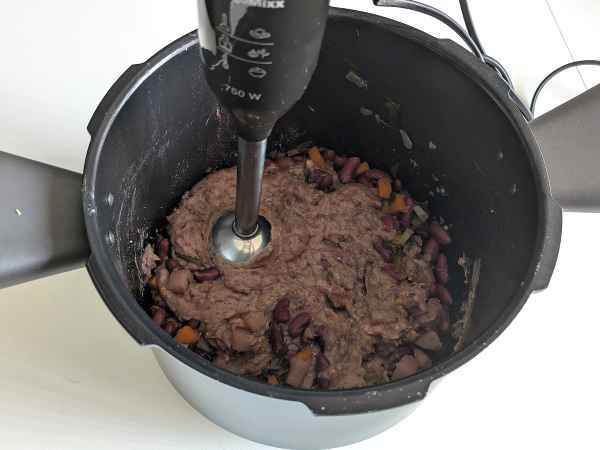 Cette recette traditionnelle de Pasta e fagioli alla veneta combine des pâtes courtes ditalini rigati avec une crème onctueuse de haricots borlotti cuits lentement avec des légumes et un cube de bouillon. La préparation utilise une cuisson en autocuiseur pour attendrir les haricots, puis un mixage partiel pour obtenir une texture à la fois crémeuse et rustique. Le plat se déguste chaud, relevé d'un filet d'huile d'olive extra vierge et d'un soupçon de poivre, offrant un équilibre parfait entre saveurs douces et texture fondante.