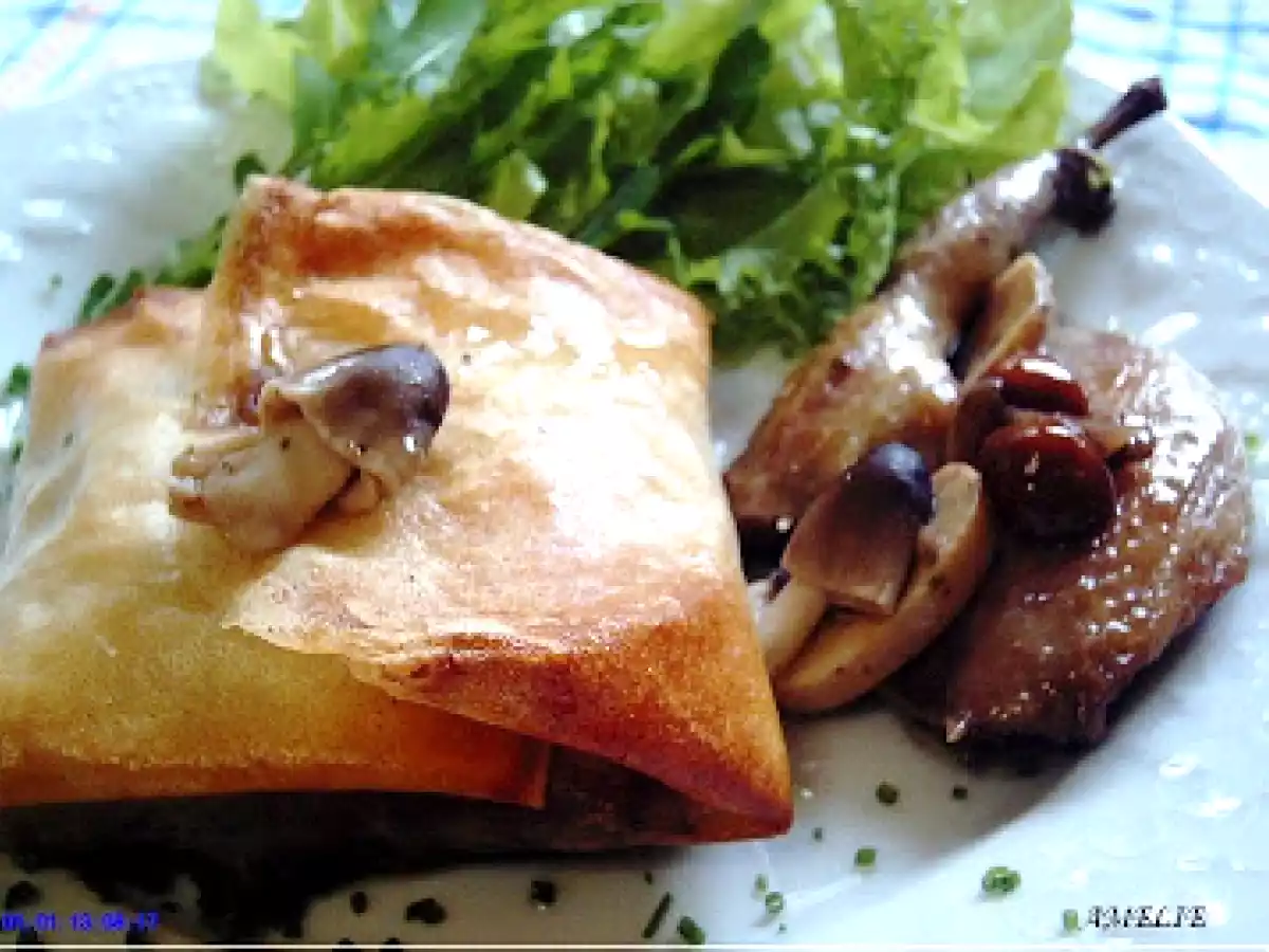 Pastilla de caille aux champignons et foie gras PrécédentSuivant Platfacile1 h 5 m771 Kcal Envoyer cette recette à un ami Imprimer cette page Poser une question à l'auteur Publier votre photo de cette recette Pour un dîner en amoureux, un petit régal croustillant et savoureux. Ingrédients 2 3 cailles 80 g de foie gras cru 6 feuilles de brick 200 g de champignons de Paris 200 g de champignons de forêt en mélange Deux échalotes 1 oignon 1 verre de Porto, une cuillère à café de vinaigre balsamique Bouillon de volaille (une tasse) Persil Citron