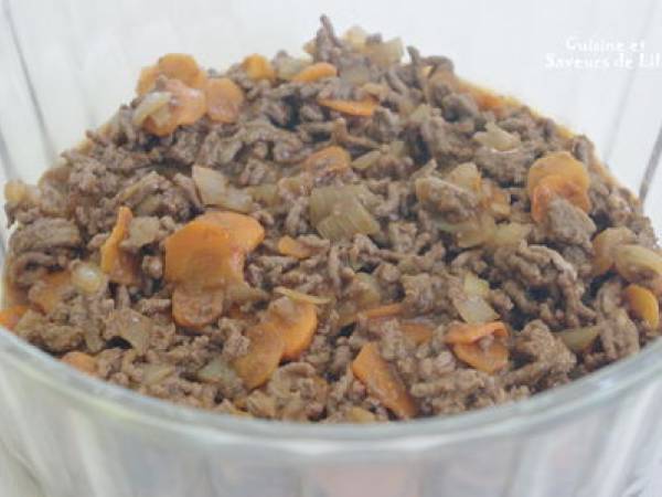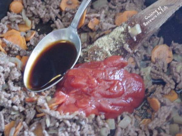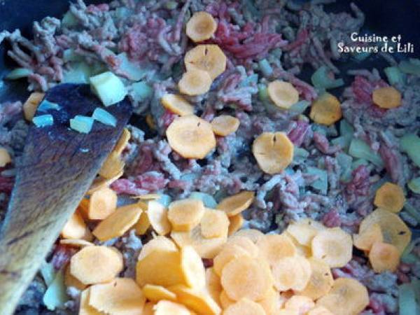 - Ajouter le boeuf haché et la carotte épluchée et coupée en très fines rondelles. Cuire pendant 5 minutes à feu moyen en remuant de temps en temps.